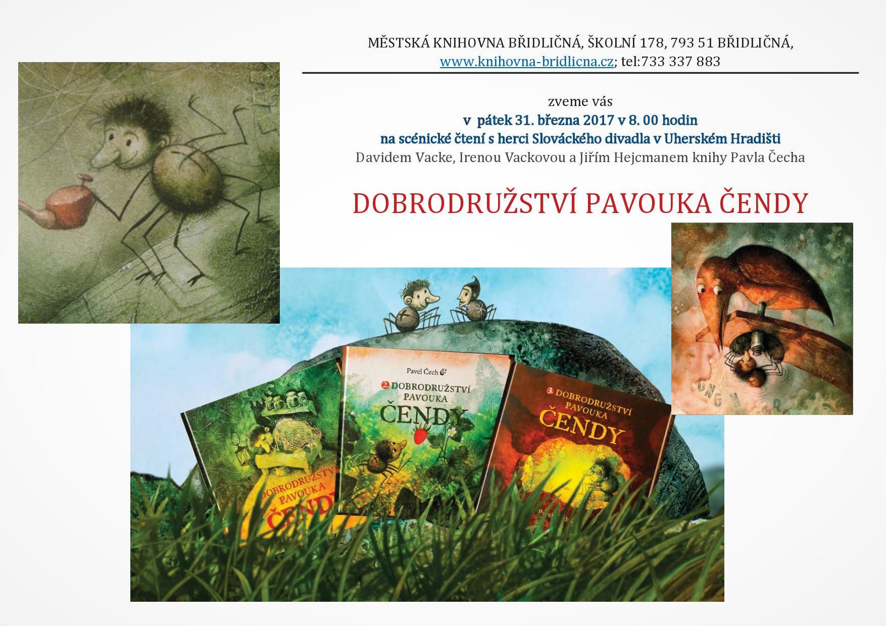 V pátek 31. 3. 2017 V 8. 00 hodin proběhne v knihovně pro žáky II. a III. tříd ZŠ Břidličná a ZŠ Rýžoviště scénické čtení s herci Slováckého divadla v Uherském Hradišti Davidem Vacke, Irenou Vackovou a Jiřím Hejcmanem knihy Pavla Čecha