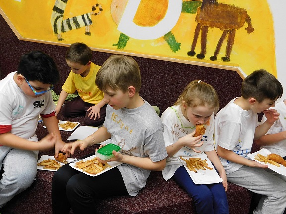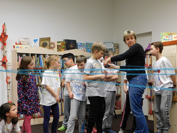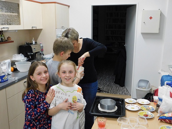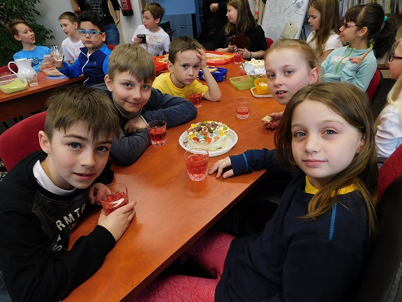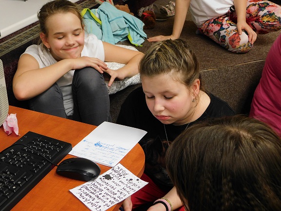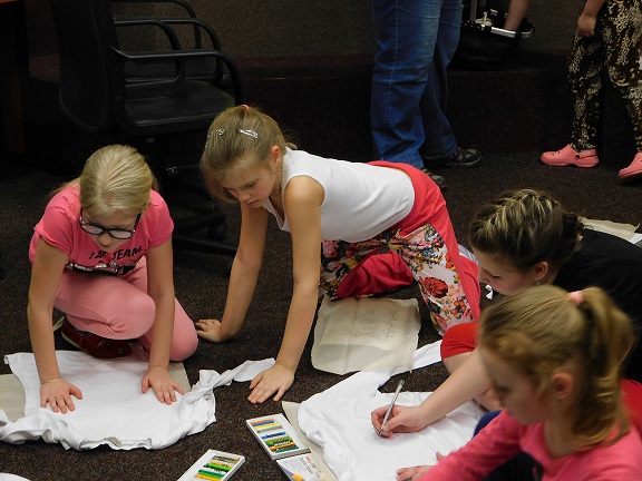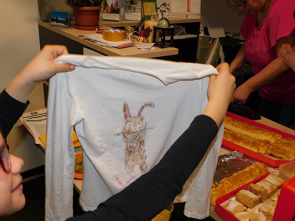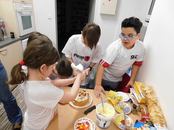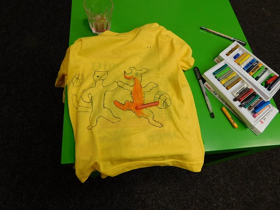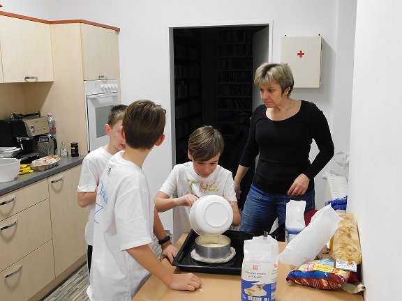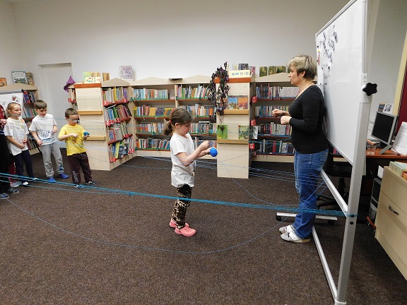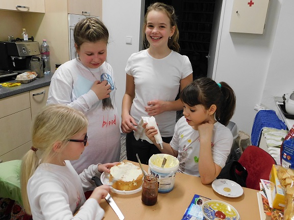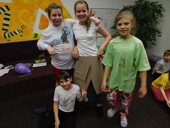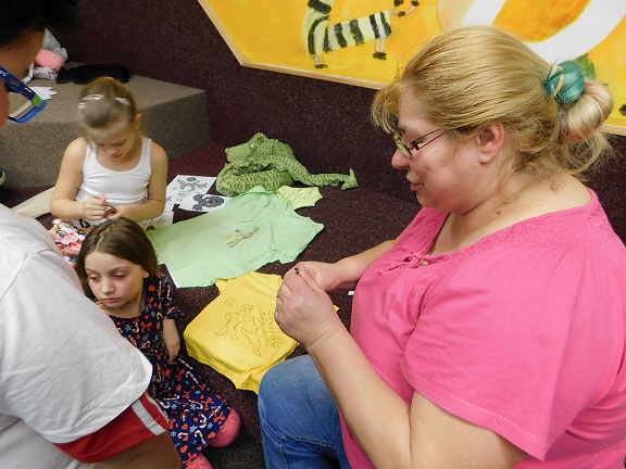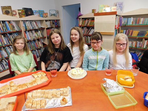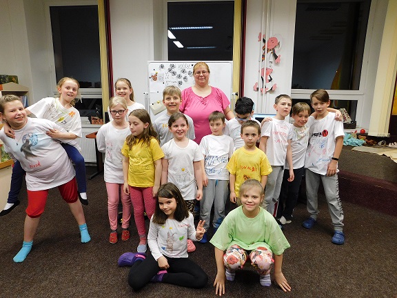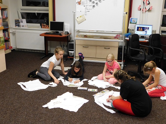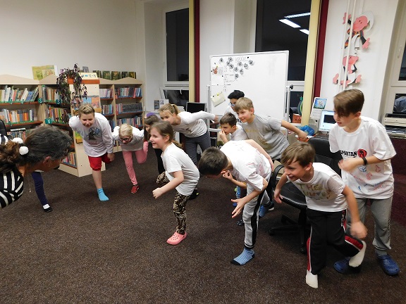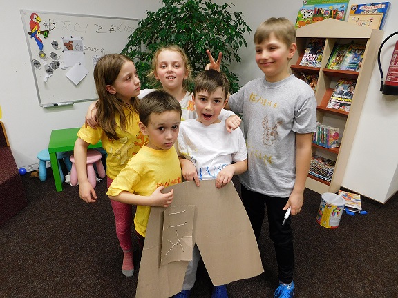 v knihovně nocovalo 14 dětí. Po příchodu jsme se pustili do čtení knihy Josefa Čapka, Povídání o pejskovi a kočičce. Pohádky, které byly pomůckou při plnění soutěžních otázek, si děti přečetly ve družstvech, a pak se vydaly hledat po knihovně myšky s otázkami, na které měly odpovídat. Výtvarná dílna s Luckou a malování na trička s obrázky pejska a kočičky nocležníky bavila, každý si namaloval buď postavičky pejska a kočičky, nebo použil vlastní fantazii. Během večera si každé družstvo upeklo a nazdobilo svůj dortík, který se dětem opravdu povedl, a dokonce i chutnal. Nikoho bříško nebolelo. Pokračovali jsme v pohybových soutěžích, zašívali pejskovi kaťata, motali klubíčka a nechyběla ani stezka odvahy od Libušky, na kterou se děti moc těšily. Usínali jsme s mluveným slovem Povídání o pejskovi a kočičce. Maminky nám přichystaly plno dobrot, sponzoři dodali ovoce a párky, čaj z várnice tekl proudem. Všem se v knihovně moc líbilo, a už se těší na další nocování.